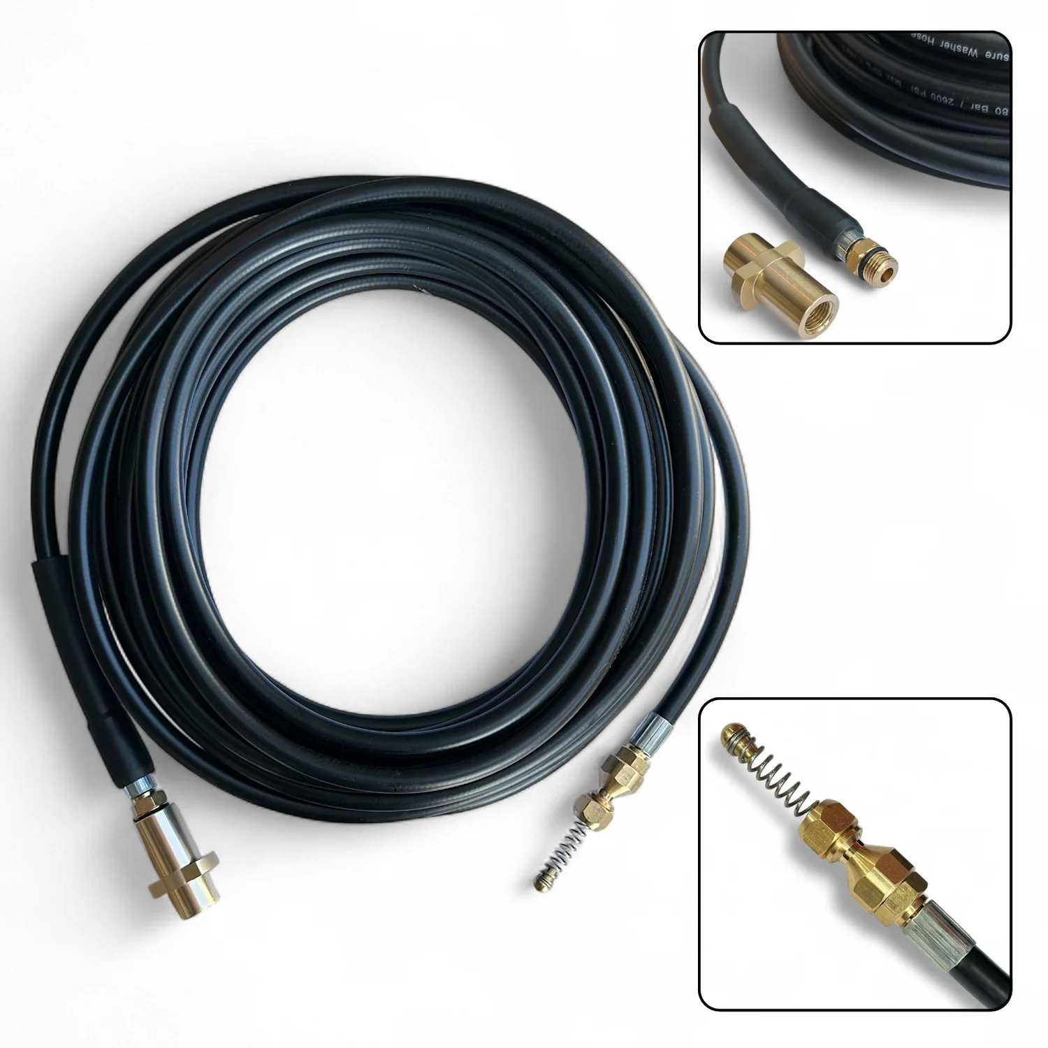 Шланг совместим с пистолетами моек высокого давления разных брендов, что делает его универсальным инструментом для бытового и профессионального использования. Надежный, износостойкий и простой в использовании – идеальное решение для прочистки труб, стоек, ливней и других канализационных систем.