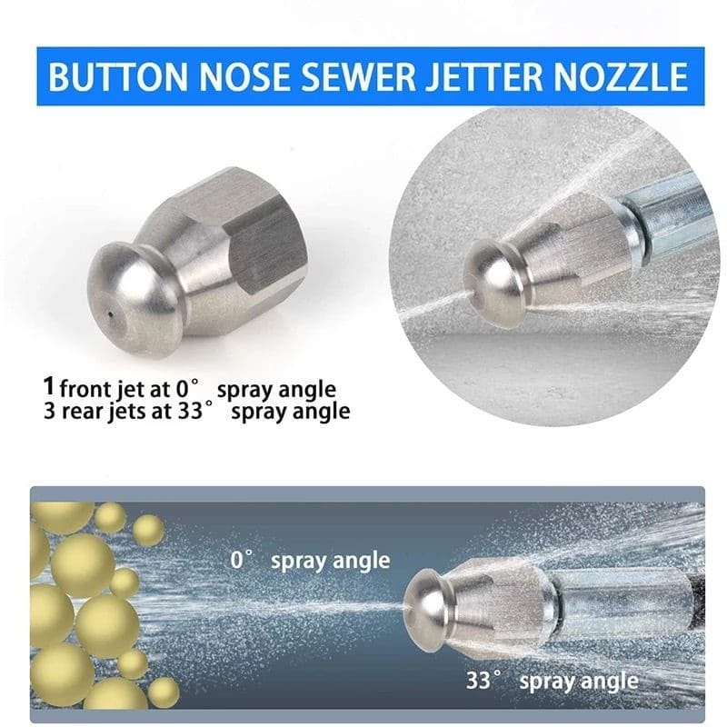 Оснащен специальной форсункой, имеющей одну мощную струю вперед для пробивки даже сложных засоров, а также три струи назад, способствующих продвижению шланга по трубе и тщательной очистке ее стенок. Такая конструкция позволяет эффективно бороться с грязью, жировыми отложениями, илом и другими загрязнениями.