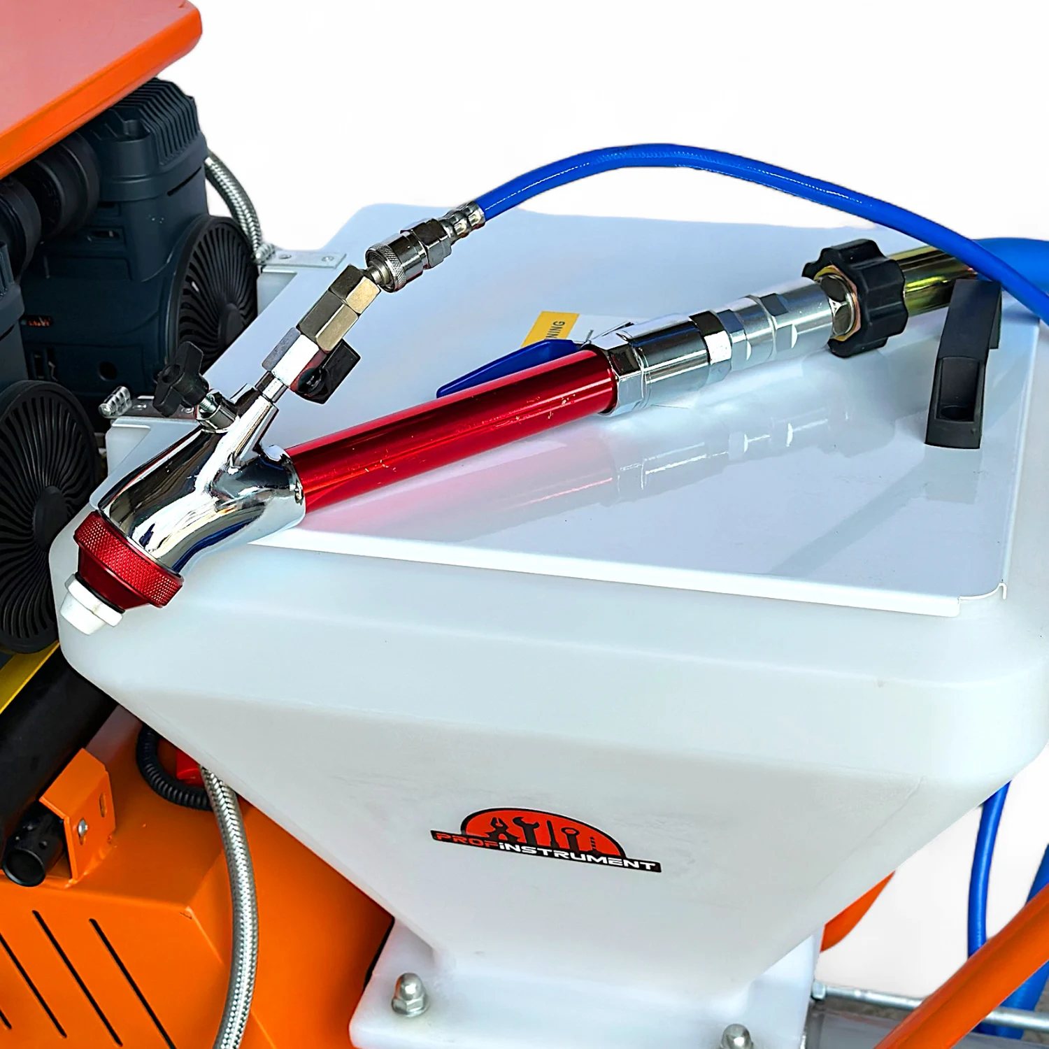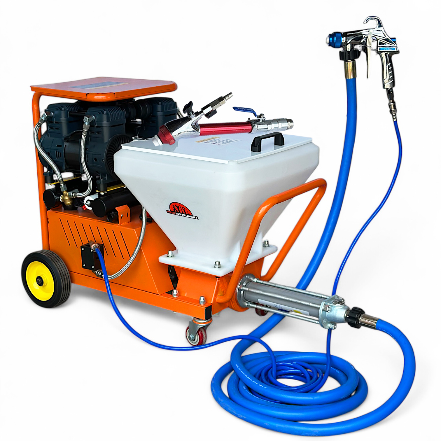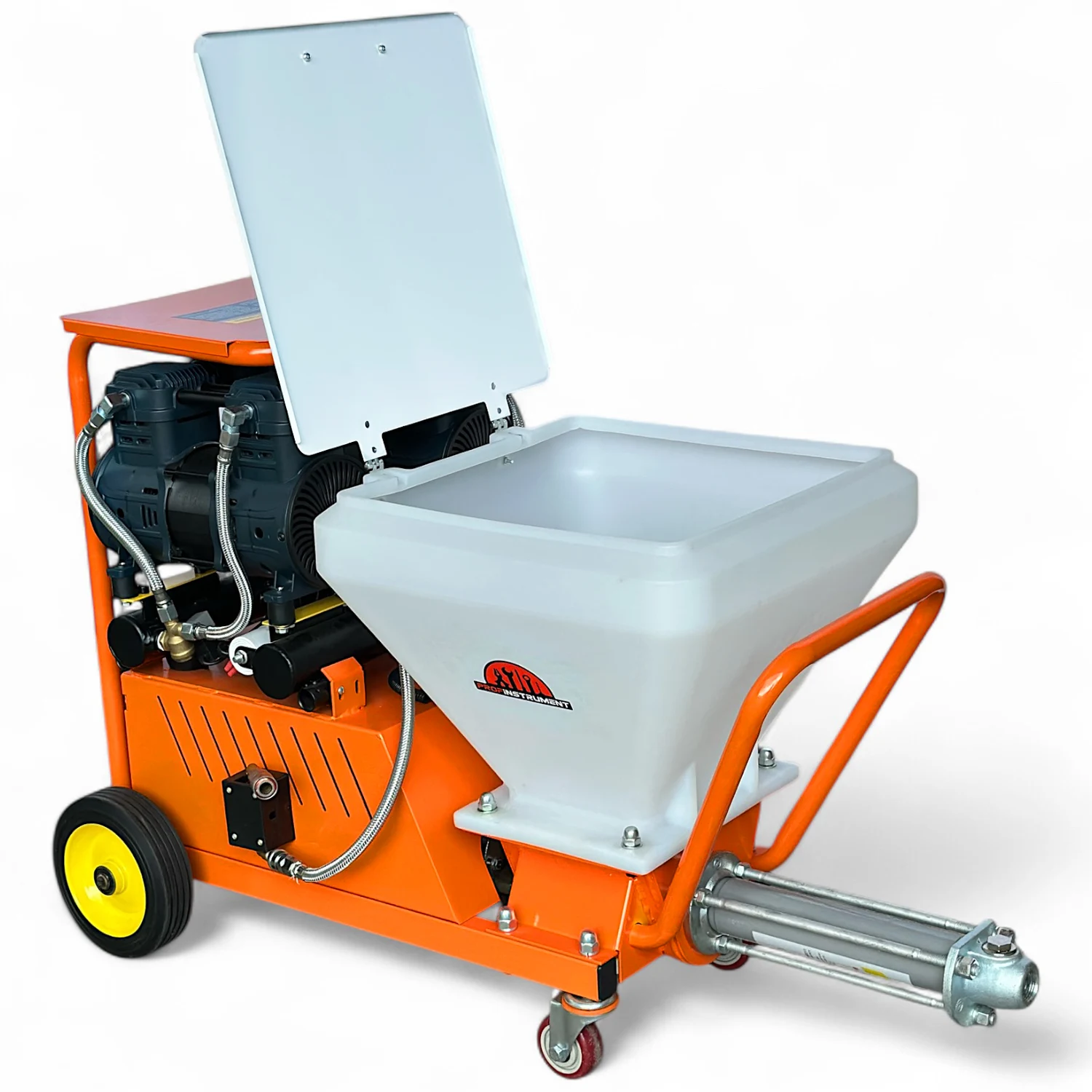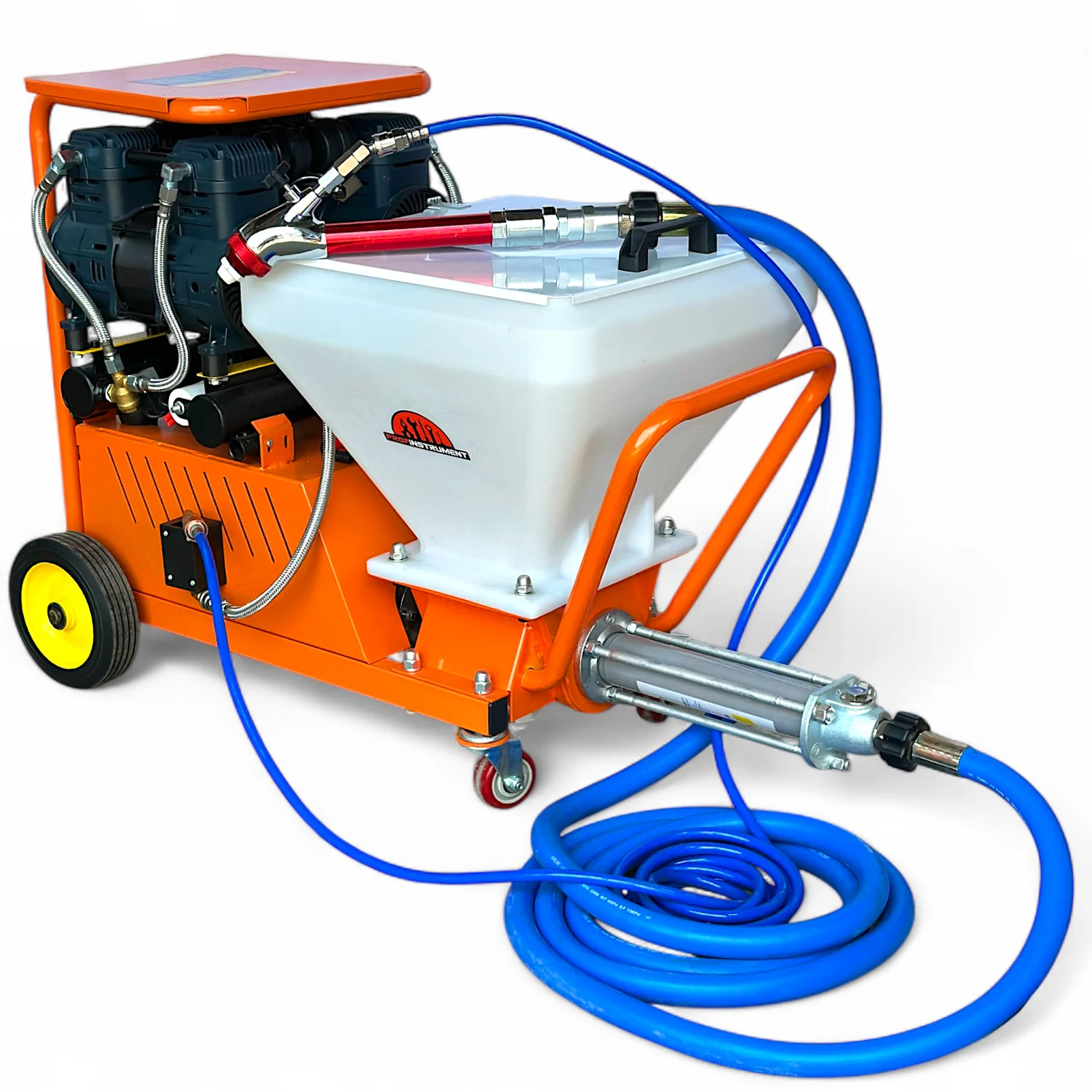Шпаклево-штукатурная станция со шнековым насосом и встроенным четырехцилиндровым безмасляным компрессором предназначена для подачи и нанесения готовых строительных растворов под давлением до 30 бар с последующим распылением с помощью сжатого воздуха.
