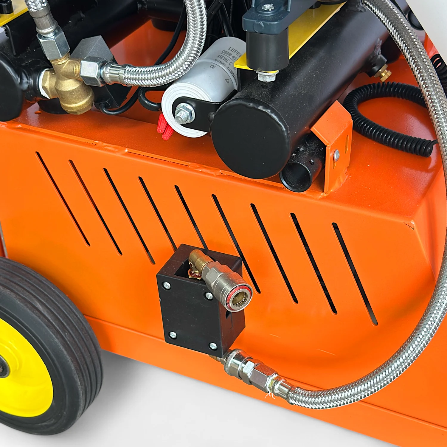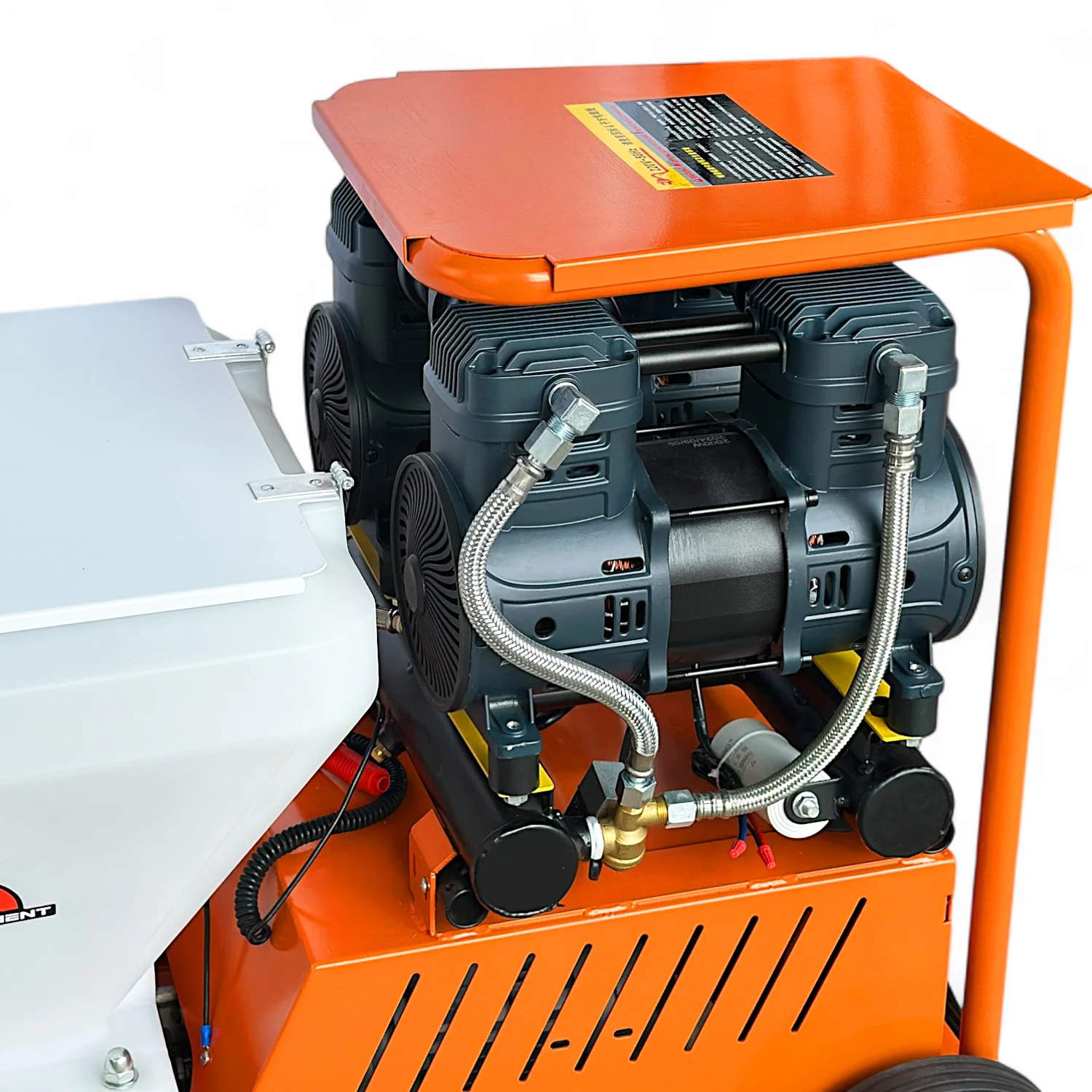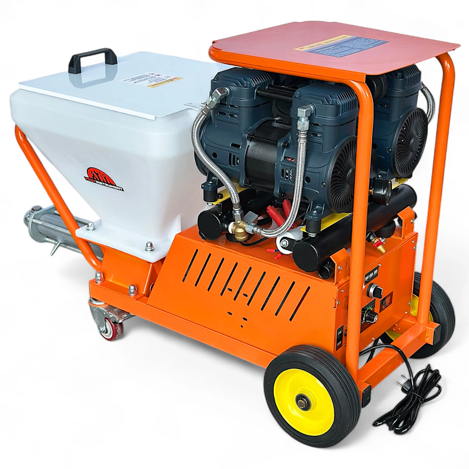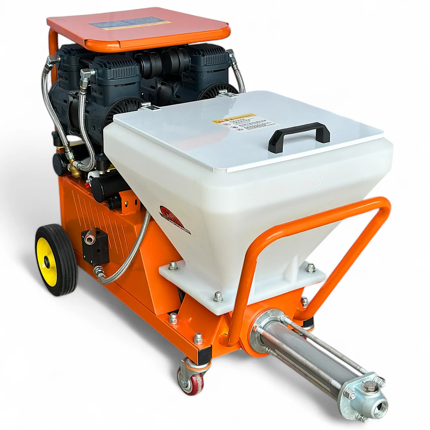 Шпаклево-штукатурная станция со шнековым насосом и встроенным четырехцилиндровым безмасляным компрессором предназначена для подачи и нанесения готовых строительных растворов под давлением до 30 бар с последующим распылением с помощью сжатого воздуха.