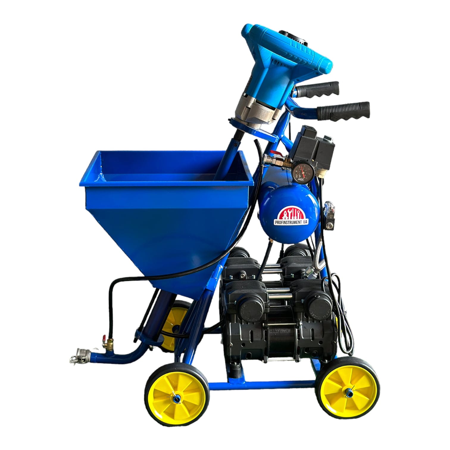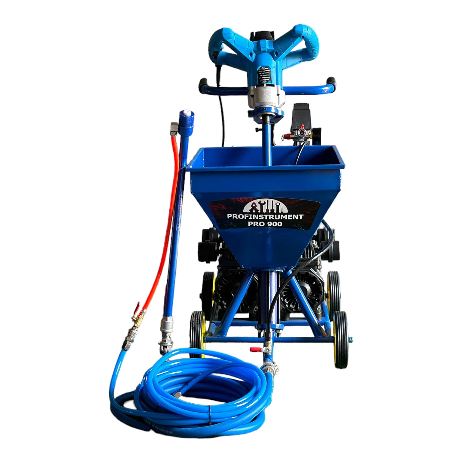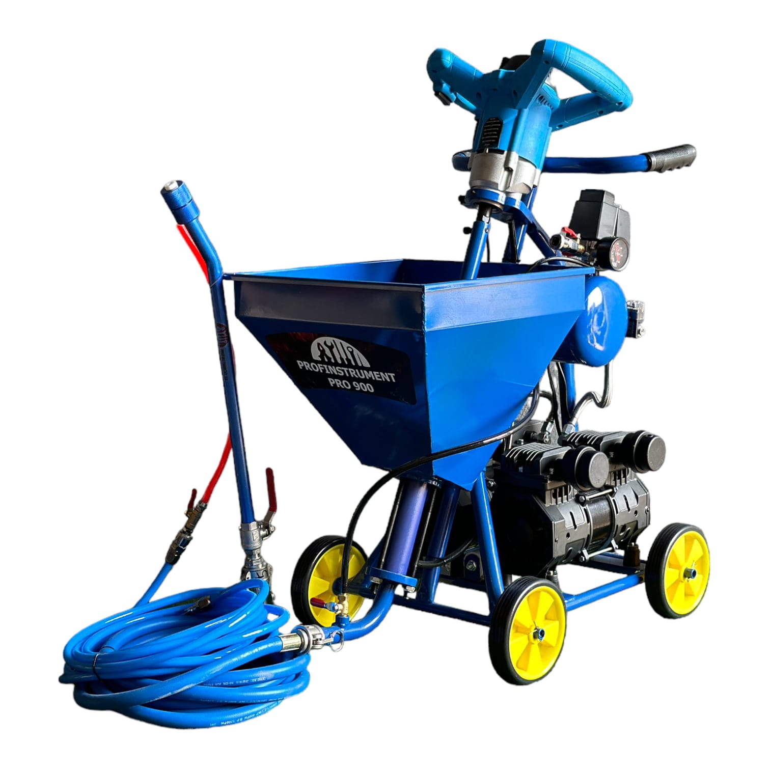 Штукатурная станция Profinstrument PRO-900 – со встроенным компрессором предназначена для подачи и нанесения готовых строительных растворов под давлением до 20 бар и распыления с помощью сжатого воздуха.