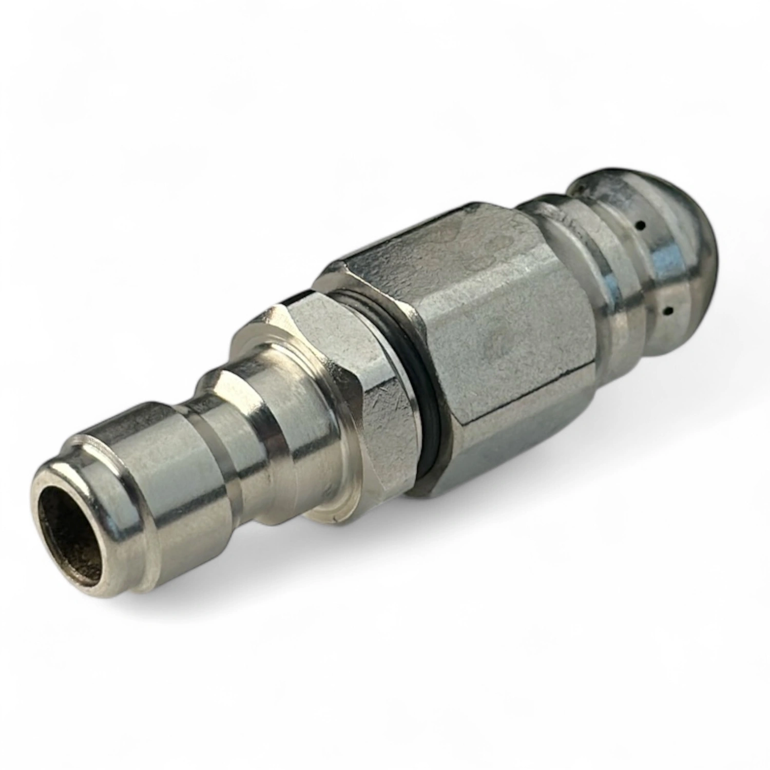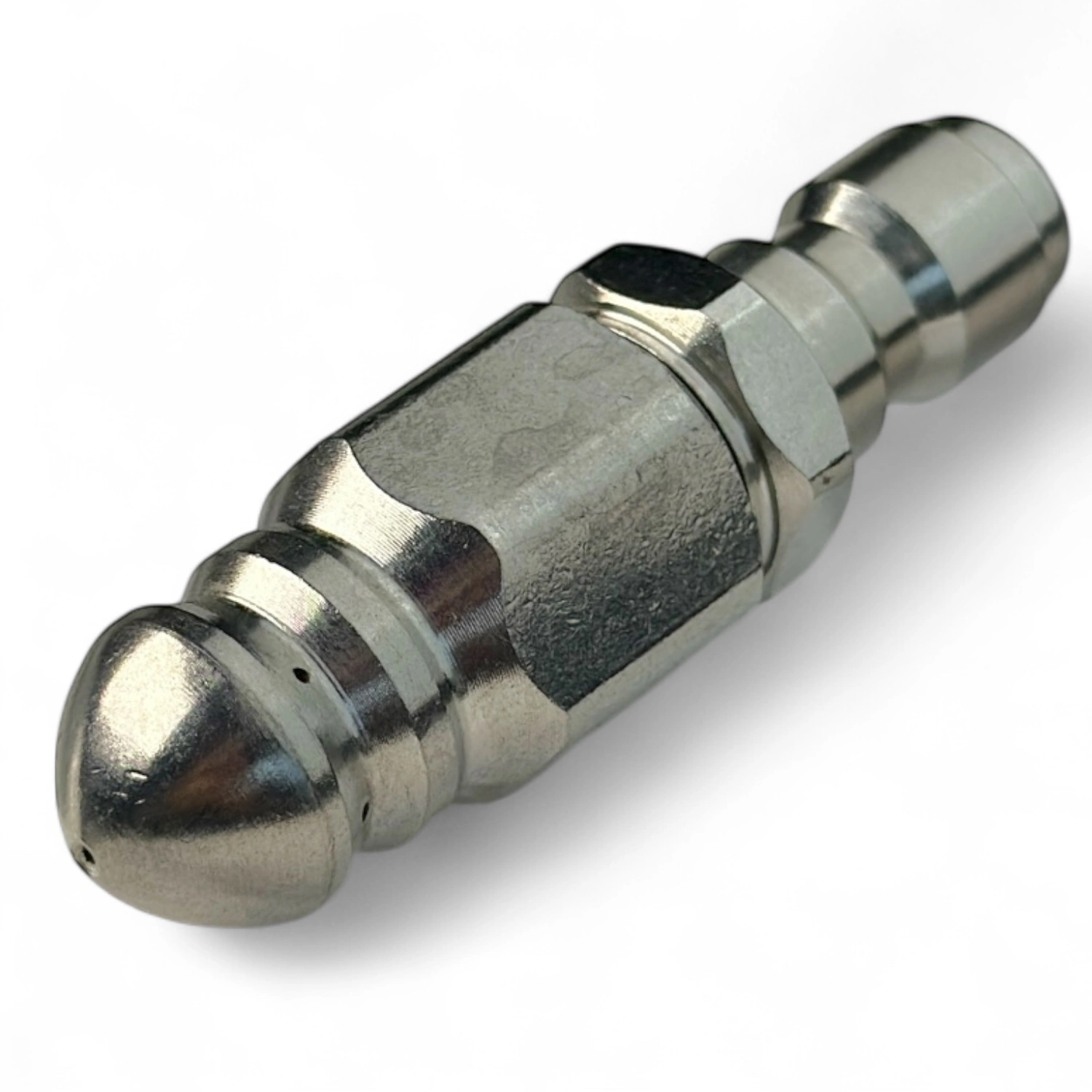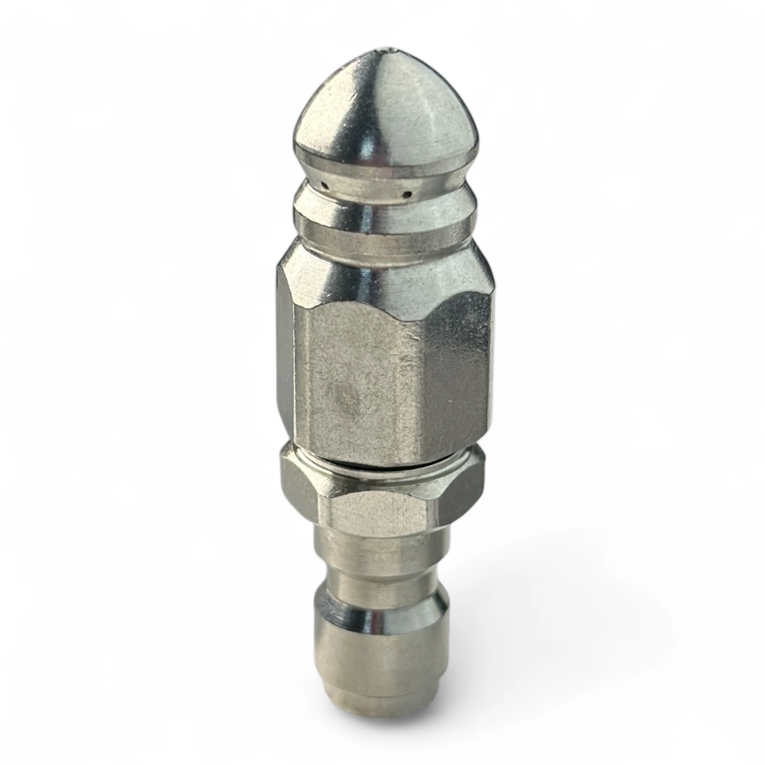 Прочная насадка из нержавеющей стали для промывки труб, канализации и ливней под высоким давлением. С быстросъемным соединением 1/4 дюйма, 1 отверстие направлено вперед под давлением, 6 отверстий назад для смыва загрязнений. Рабочее давление до 4000 PSI подходит для горячей и холодной воды.