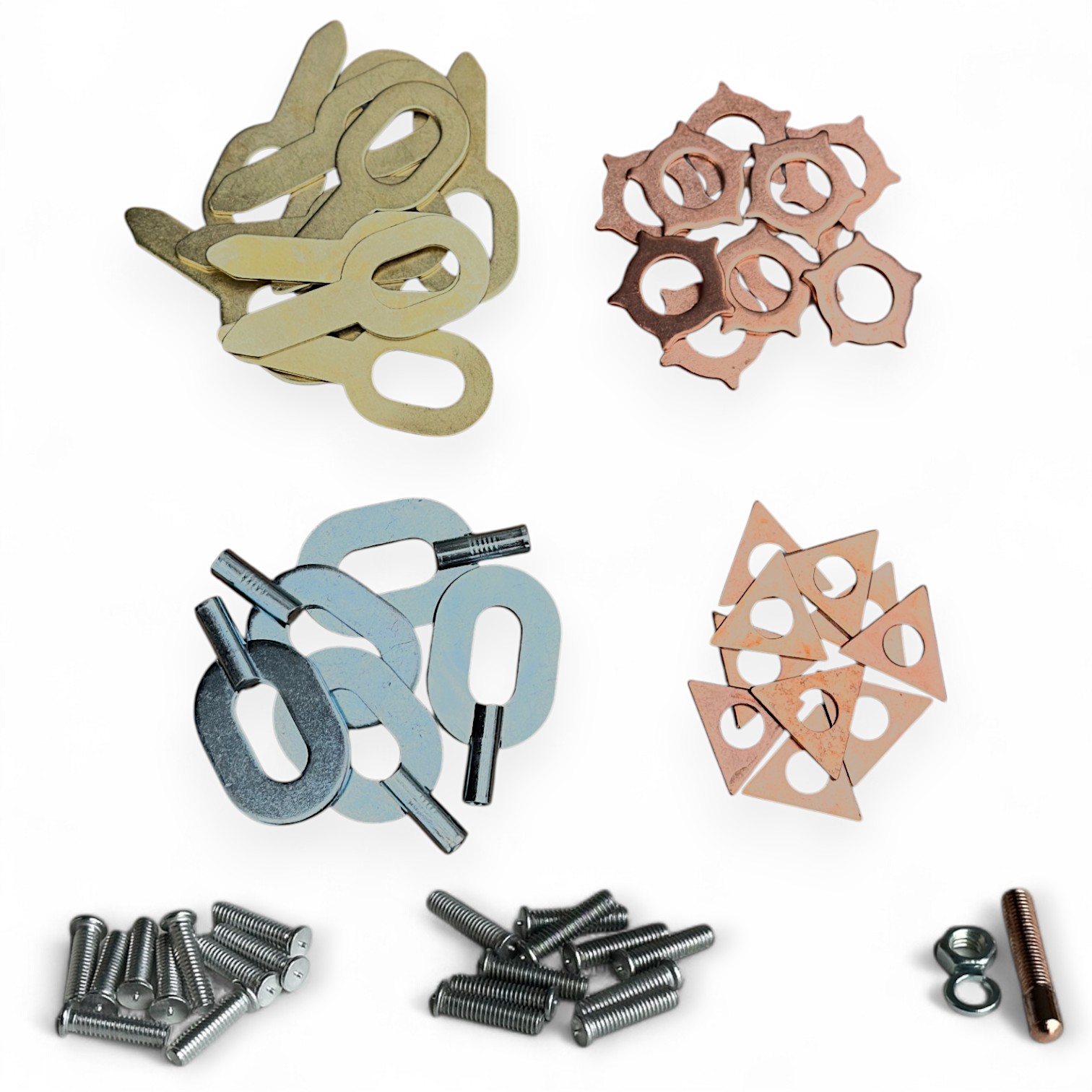Установка поставляется с полным комплектом для точечной сварки – винты, шайбы, клепки и тяговые звездочки для нагрева листа. Это делает ее универсальным инструментом для ремонта кузова, исправления деформаций и восстановления металлических конструкций.
