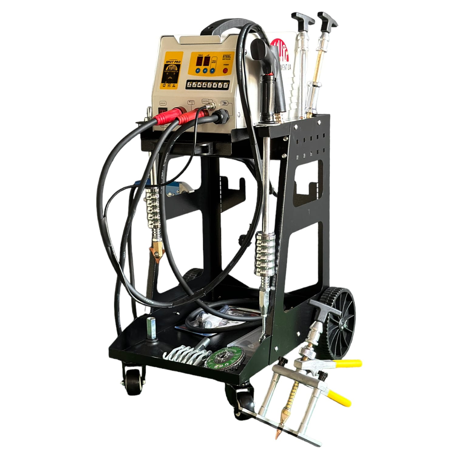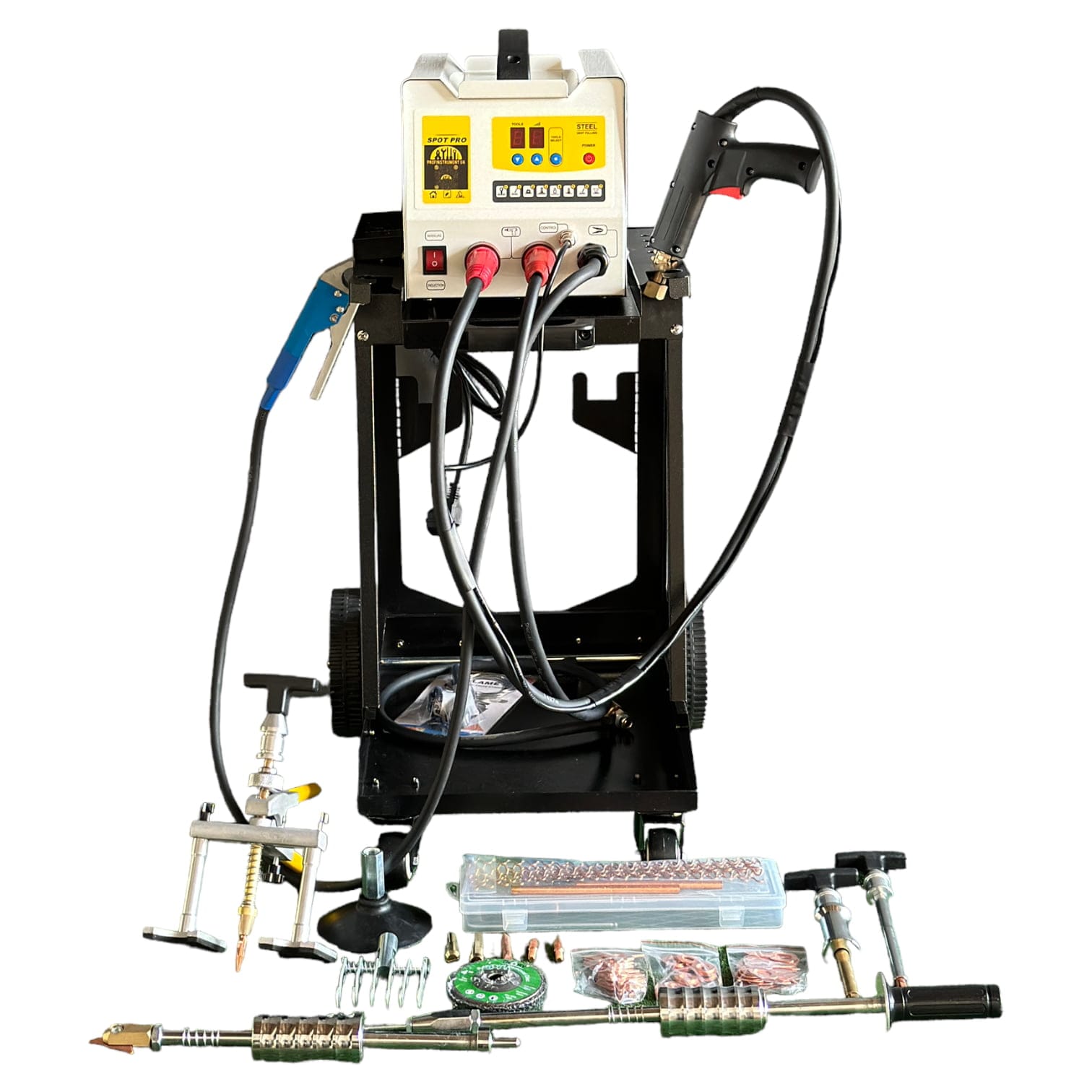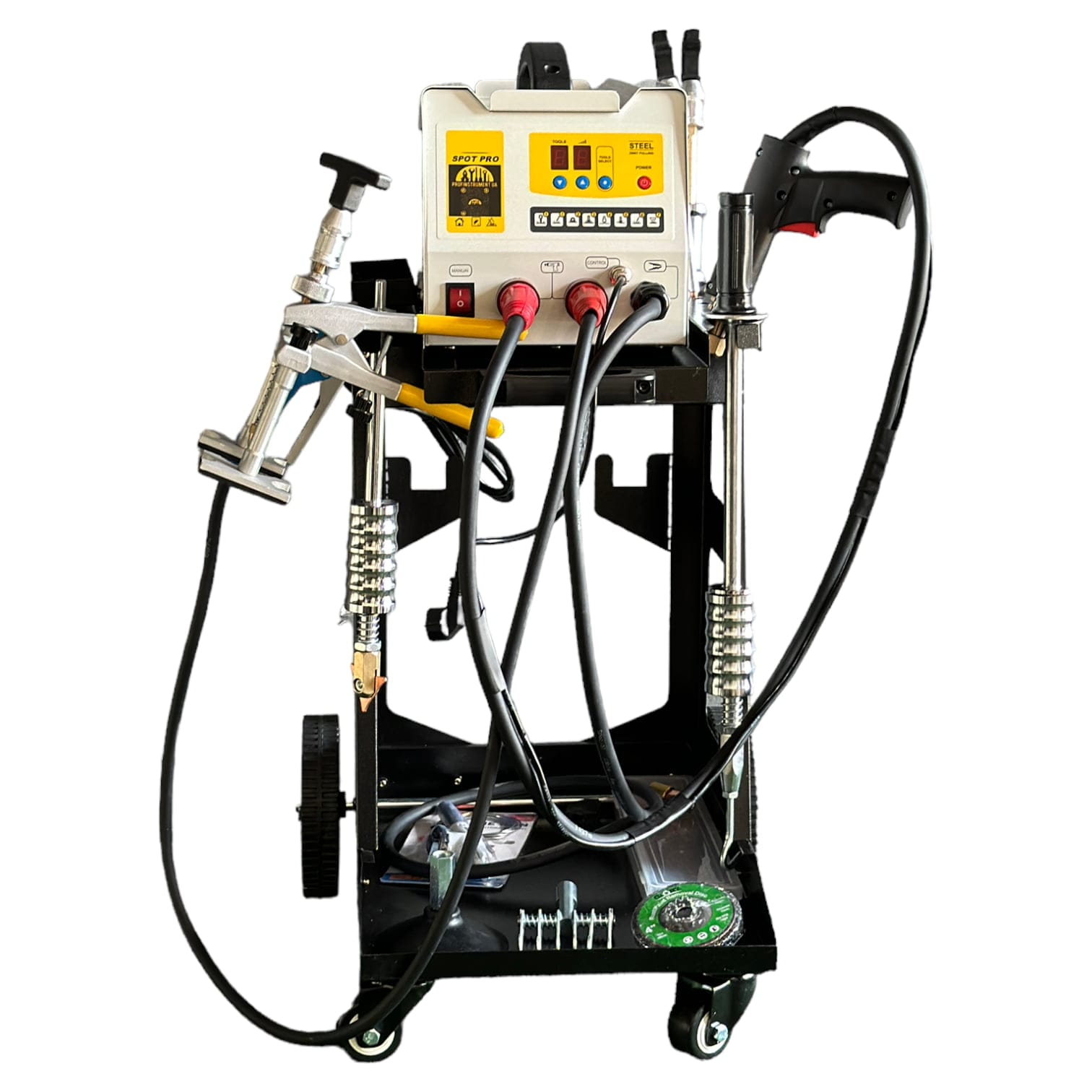 Аппарат для точечного рихтовки споттер Profinstrument SP1400 расположен на раме, где можно хранить аксессуары и оснащен колесами для маневрирования по рабочему участку. Споттер имеет процессорное управление и 7 режимов работы. Высокая мощность позволяет использовать споттер для точечной сварки металлов.
