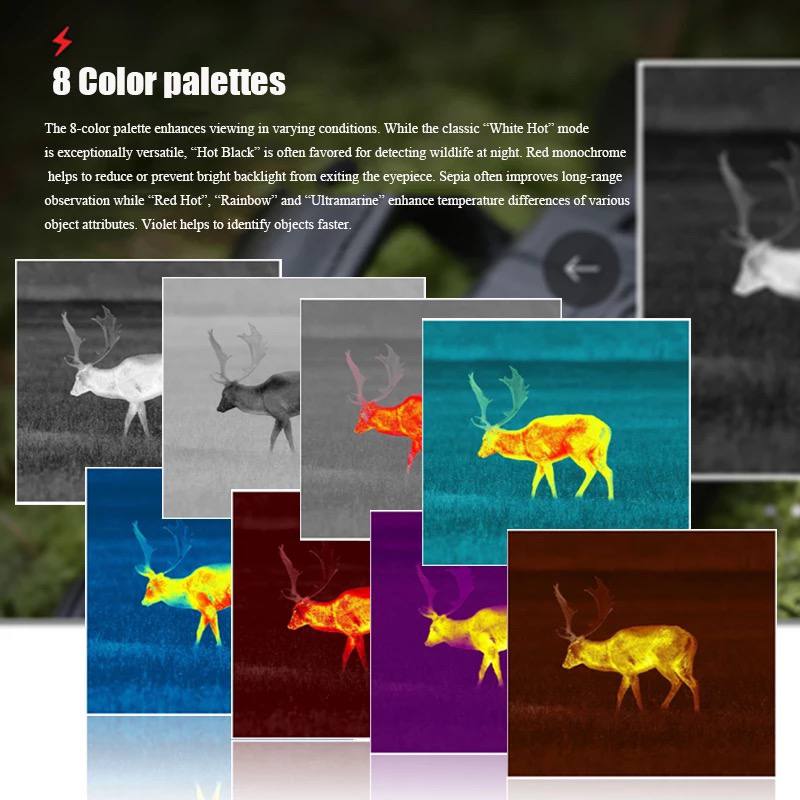 • Шесть цветовых палитр: радуга, горячий металл, белое тепло, черное тепло, насыщенность желтого цвета и режим наблюдения птиц
