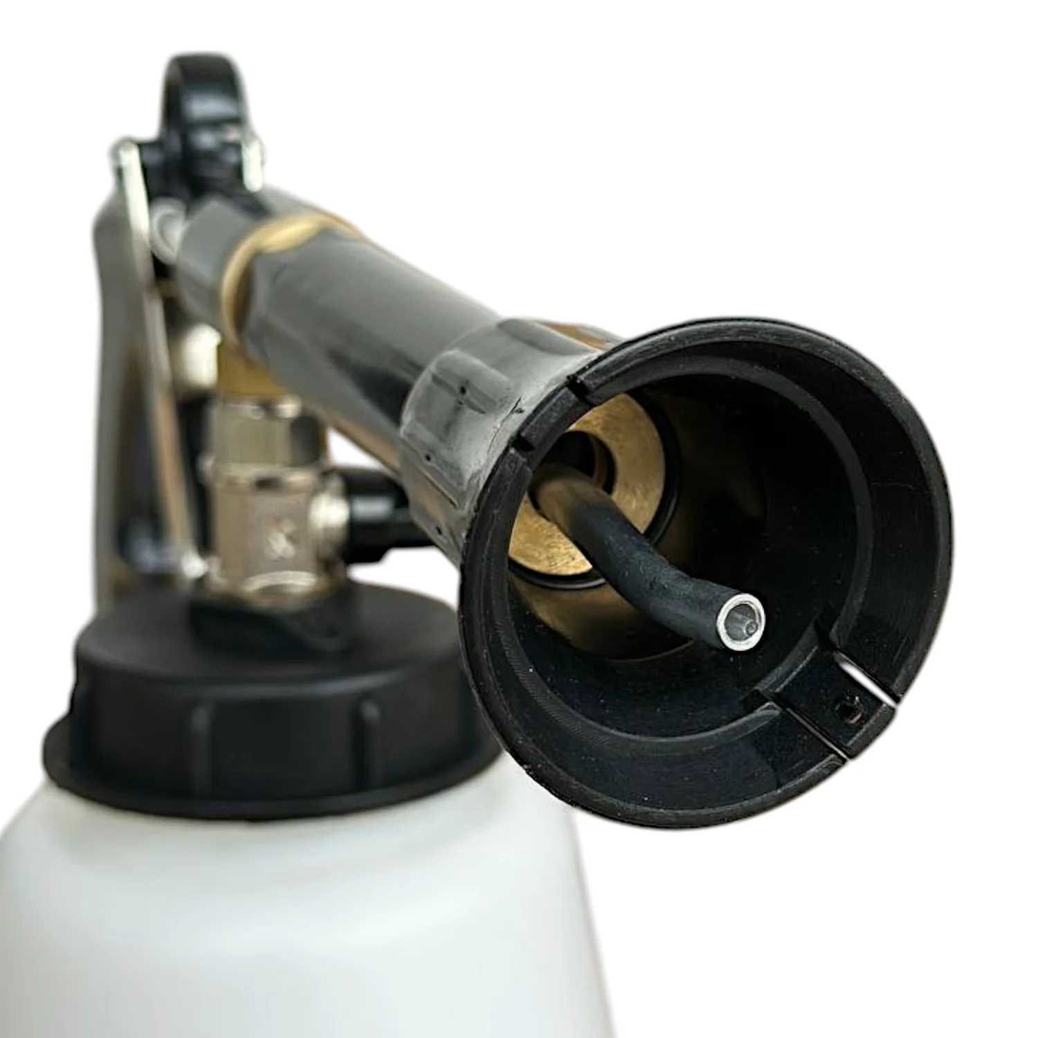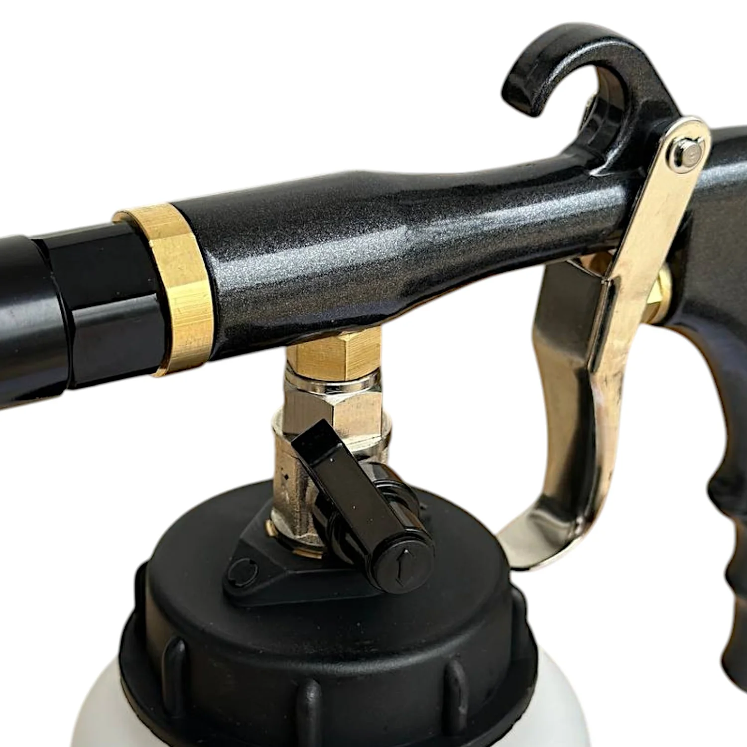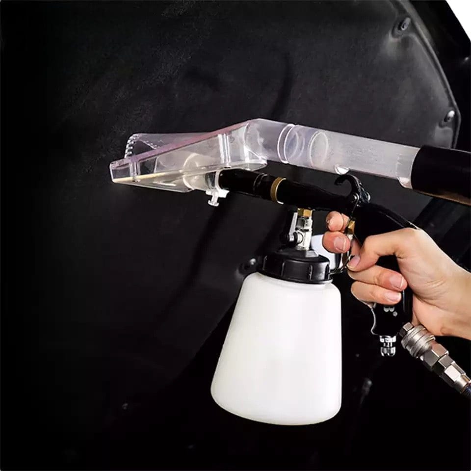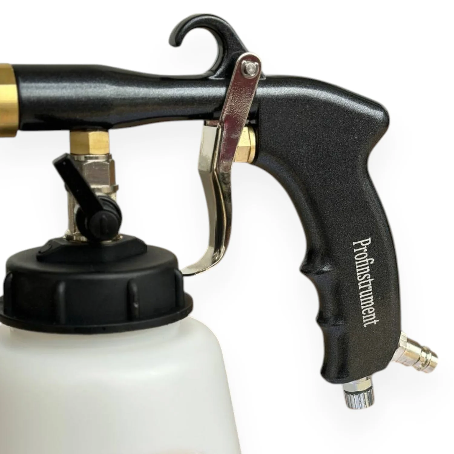 Пневмопистолет-экстрактор с бачком для химии оснащен гибкой пластиковой насадкой малого диаметра, вращающейся под действием сжатого воздуха. Через нее распыляется моющая жидкость, позволяющая эффективно удалять загрязнения разного происхождения из ткани, велюра, винила и пластика. В сочетании с экстракторной насадкой это обеспечивает отличный результат за короткое время без необходимости использования традиционного водного экстрактора. Идеально подходит для очистки сидений, обшивки дверей, потолка автомобиля. Благодаря быстрой и качественной работе, отлично подходит для экспресс-химчистки на автомойках и в автосервисах.