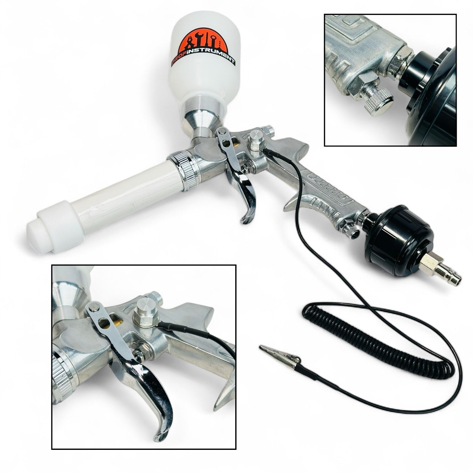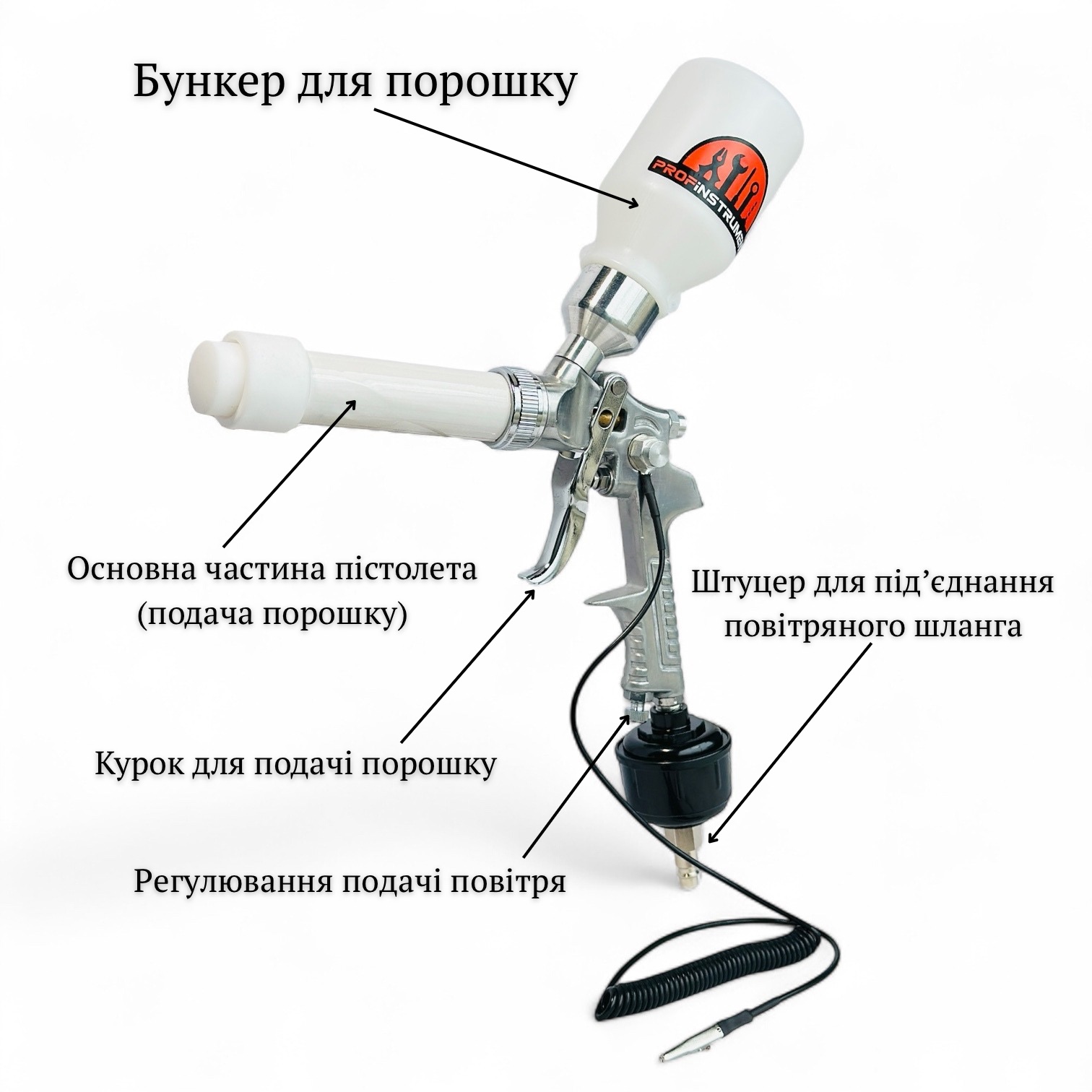 Трибостатический распылитель Profinstrument с бункером, предназначенный для небольших объемов окрашивания, перекраски, окрашивания труднодоступных поверхностей и острых углов, нанесения толстых слоев краски.